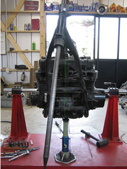 きょうは、Z1Fのフレーム測定です。 フレーム修正機と言うよりは、測定機ですよ〜、 測定機に乗せると垂直、水平、が判ります、検査軸をネックに取付レーザーで目視 (曲がってる方向が見えます。)mmで セットにあたって一番大事なのがバイクのセンターを出す事、これが正確に、 出来ませんと、曲がりの判断を誤ります、また、まちがって修正する事になります。 この修正機を開発するに到っては、まず正確に測れること、狂わない事、早くセットが出来る事、 ホイールベースの長さに関係なくセット出来る事など 、欲張った修正機です。 曲がりを直す修正シャフトがまた特許ですが、追々書いていきます。 |