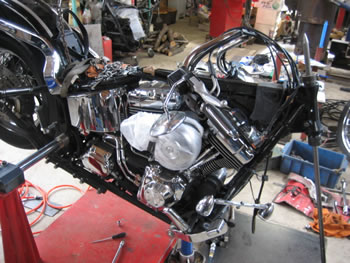 今日の修正はハーレーですよ〜ネックの曲がりは下で左側に5mm、キャスターは内側に12mm |